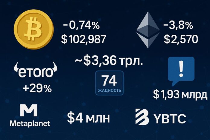 Общая капитализация рынка составляет ~$3,36 трлн, индекс страха и жадности — 74 (жадность).