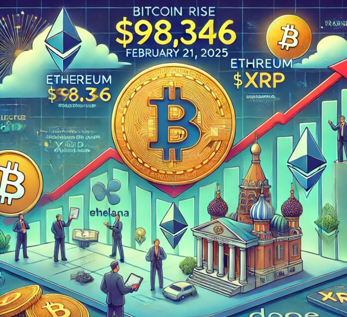 1. Рост стоимости биткоина и других криптовалют: На 21 февраля 2025 года курс биткоина достиг $98,346.4, показав рост на $1,414.96 (1.46%) за сутки. Ethereum вырос до $2,755.07, BNB — до $652.049, Solana — до $175.165. В то же время Ripple (XRP) снизился на 2.34%, до $2.65521.