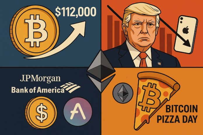 • Биткоин (BTC) достиг нового исторического максимума, превысив отметку в $112 000. Однако после заявлений президента США Дональда Трампа о возможных тарифах в 25% на iPhone и 50% на импорт из ЕС, цена BTC снизилась до $108 745, а альткоины, включая Ethereum и Solana, потеряли от 3% до 4% .