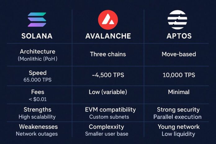 На фоне бурного развития Web3 всё больше блокчейнов предлагают быстрые, масштабируемые и дешёвые решения. Среди них выделяются Solana, Avalanche и Aptos — три проекта нового поколения, конкурирующие за лидерство в децентрализованной экосистеме. Разберёмся, чем они отличаются.